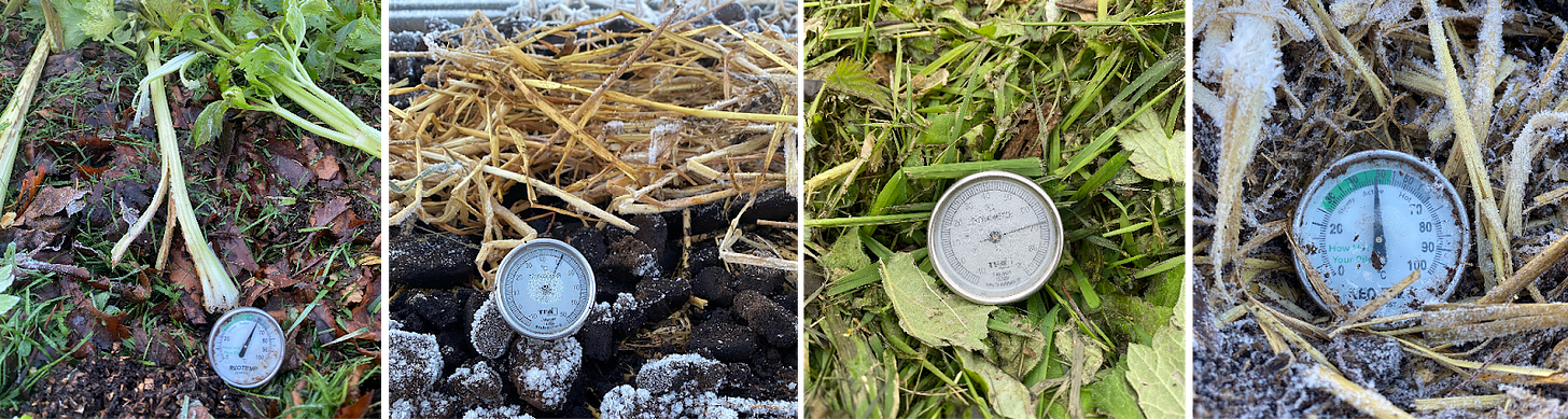 I become a magpie for browns: collecting and stockpiling autumn leaves and wood chips. Piles accumulated around the house alongside heaps of gifted cow manure, blocking the entrance and forcing me to park my car next door. Friends would phone and ask if I wanted the cardboard from their flat pack furniture. I ran woody brassica stalks and tomato plants through a garden shredder to make them the optimal size for quick breakdown. I bought long probe thermometers and began to track the temperature fluctuations to make sure the pile was getting hot enough (but not too hot).