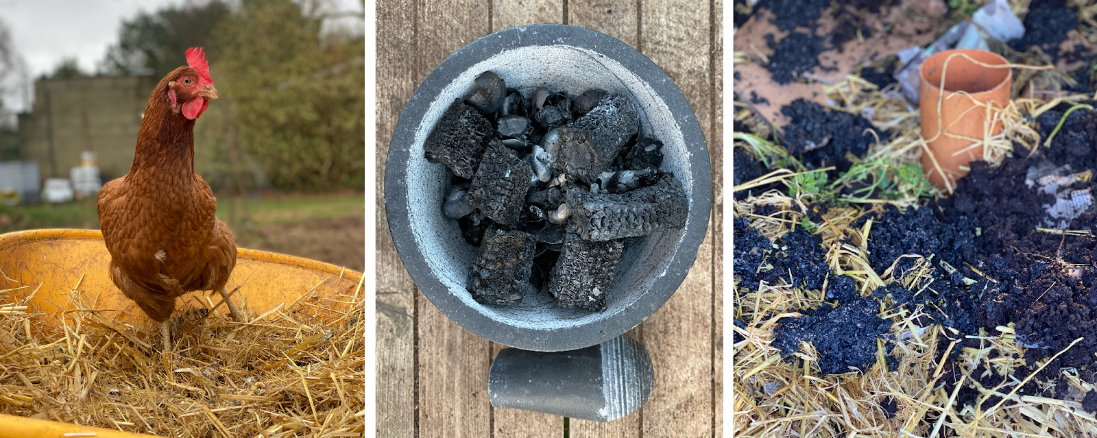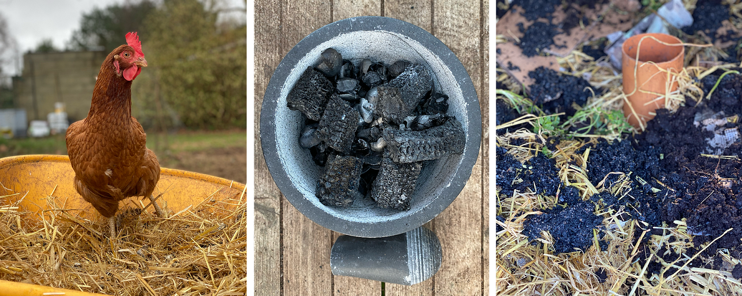 I read widely, trying to break down the complex scientific advice. I experimented with different ingredients and processes to make sense of it. As well as making enough compost, I wanted to try and close my own waste loop. The hens ate our food scraps and garden thinnings, and anything they didn’t eat was scooped up and added to the heap along with the fertile straw bedding from their houses. I began to experiment with making biochar, a carbon-rich form of charcoal that, when added to the compost pile, becomes high-density housing for microbes. I packed a small purpose-made biochar burner with things that don’t rapidly decompose (nut shells, corn husks, bones, avocado skins and stones, nectarine pits) and politely asked my mum to place it in her living room stove.