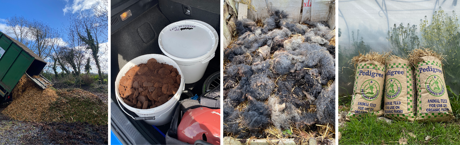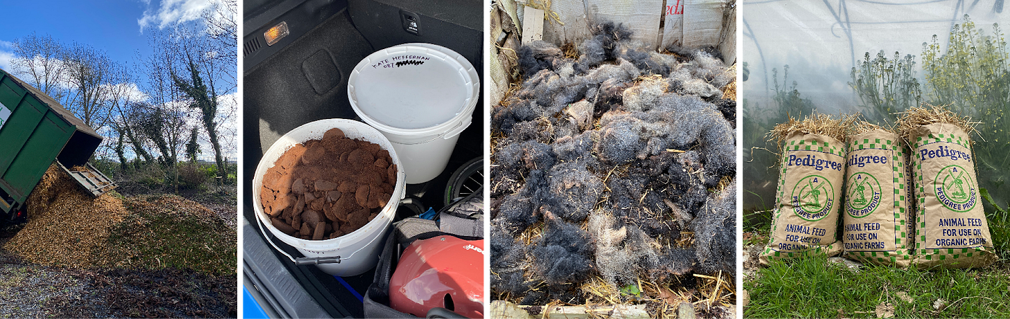 And so early on, I realised that my compost needed some help from the outside. My ingredients list expanded from there: oat straw from Kevin at the Merry Mill, wheat straw from our friend Liz, which we use for chicken bedding, cow manure from George, sheep’s wool from Laura, wood chips from tree surgeon Oliver, and waste coffee from Tom at my local café, Brew.