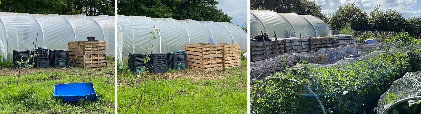 It took me a while to settle on a location for my six bays. In the end, I chose right in the centre of the garden. This is partly practical (I don’t want to have to cart waste material across the site, nor move heavy barrows of finished compost back the same path). But more so, this location is a reminder of its centrality in the garden, of the community support needed to feed it, and the community it in turn feeds, a reminder that it needs to be tended to and cared for (revise, revise, revise). But overall, its central location is a tangible reminder that the process of compost creation reflects the full seasonal lifecycle of the site, from birth to death to decomposition and round again—and that the nourishment it provides is the beating heart of the plot.
